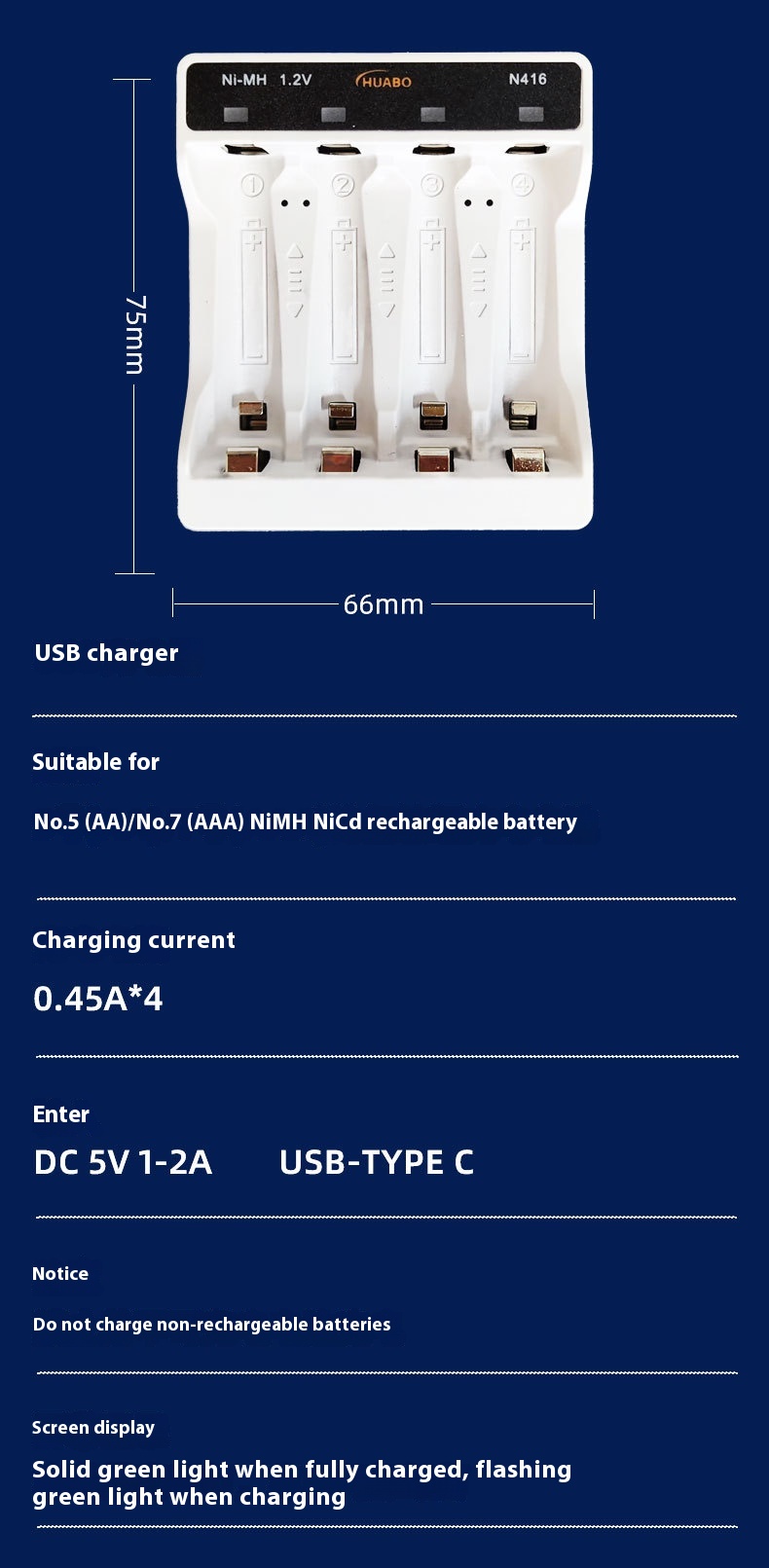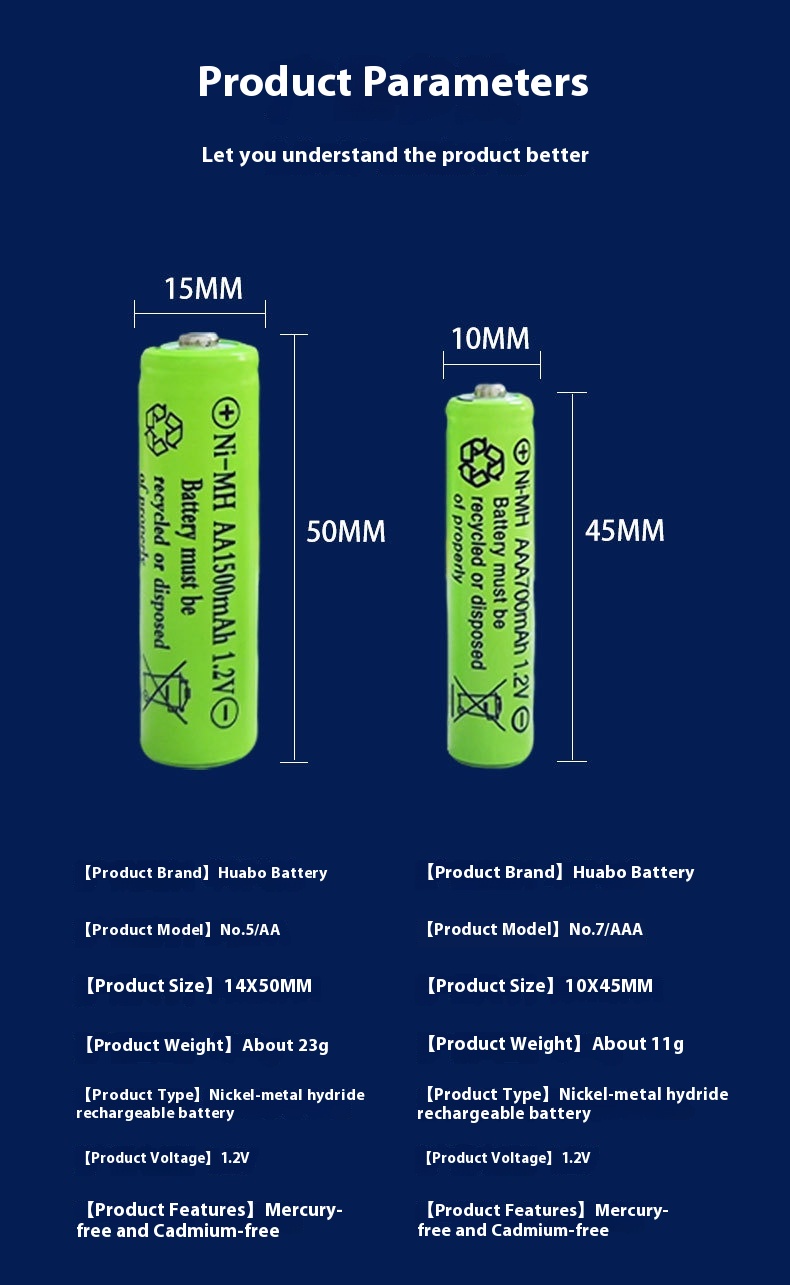 Battery Type: Ni-MH (Nickel-Metal Hydride) Capacity: 1500 mAh (AA) / 700 mAh (AAA) Voltage: 1.2V Charger Included: Yes – 4 Slots Compatibility: Standard AA/AAA devices (remote controls, lamps, toys, cameras, etc.)